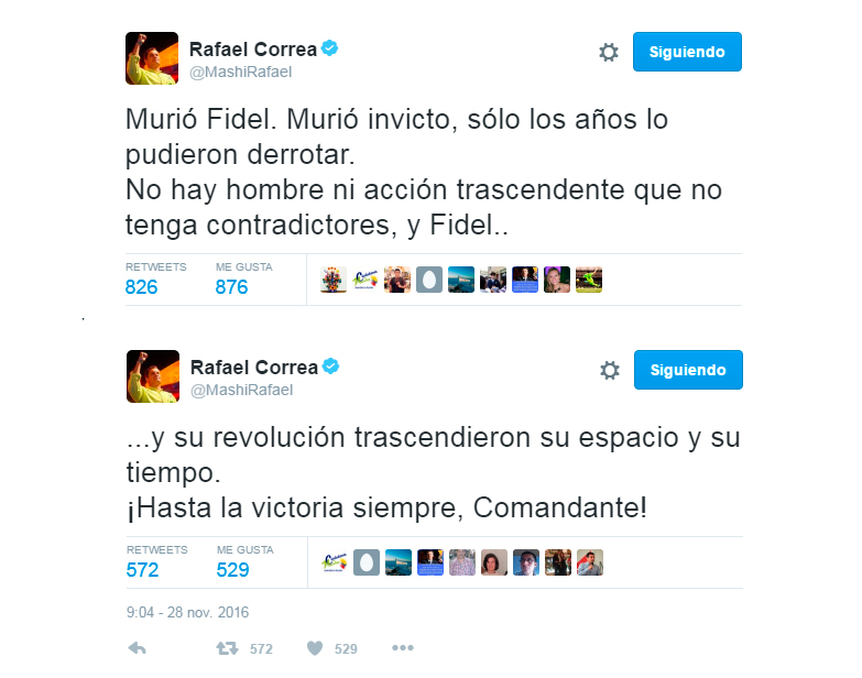 Correa fue uno de los primeros líderes mundiales en manifestar pesar luego del anuncio al mundo del deceso de Fidel Castro por parte del presidente de los Consejos de Estado y de Ministros de Cuba, Raúl Castro, en la noche del 25 de noviembre.