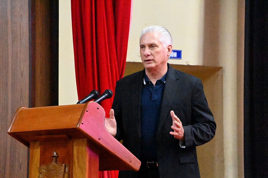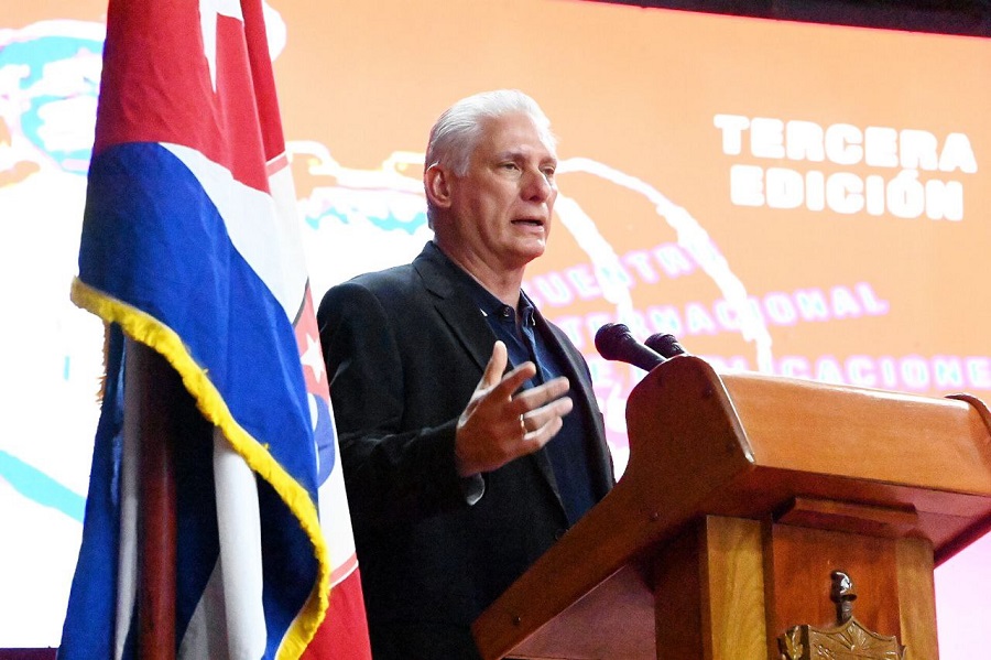 Al hablar de la manipulación mediática contra Cuba, el Presidente ratificó que los adversarios tratan de sembrar la idea de caos, y «Cuba está firme y de pie», expresó, interrumpido por los aplausos de los participantes.