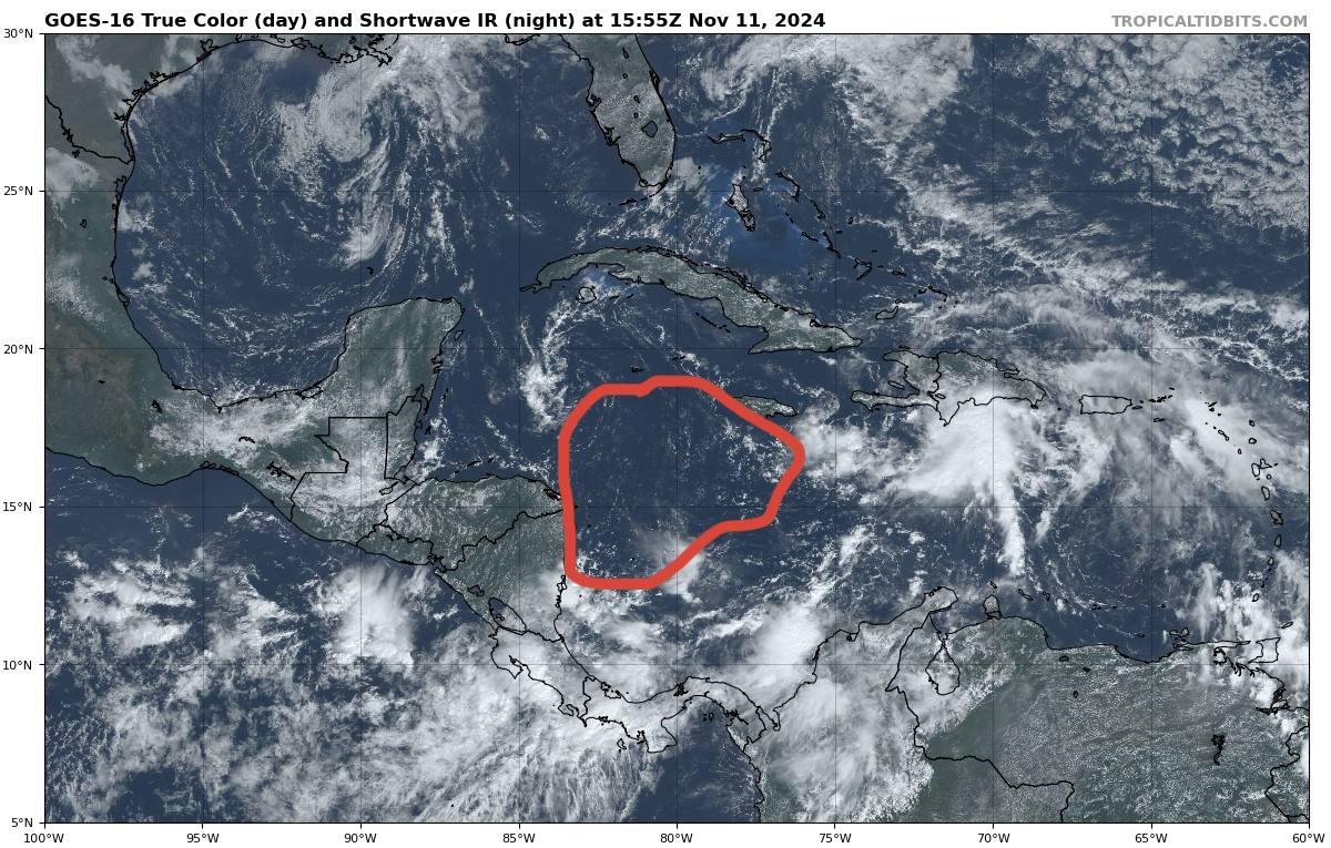 Las condiciones ambientales parecen propicias para el desarrollo, y es probable que se forme una depresión tropical para el final de la semana a medida que el sistema se mueve lentamente hacia el oeste del mar Caribe.