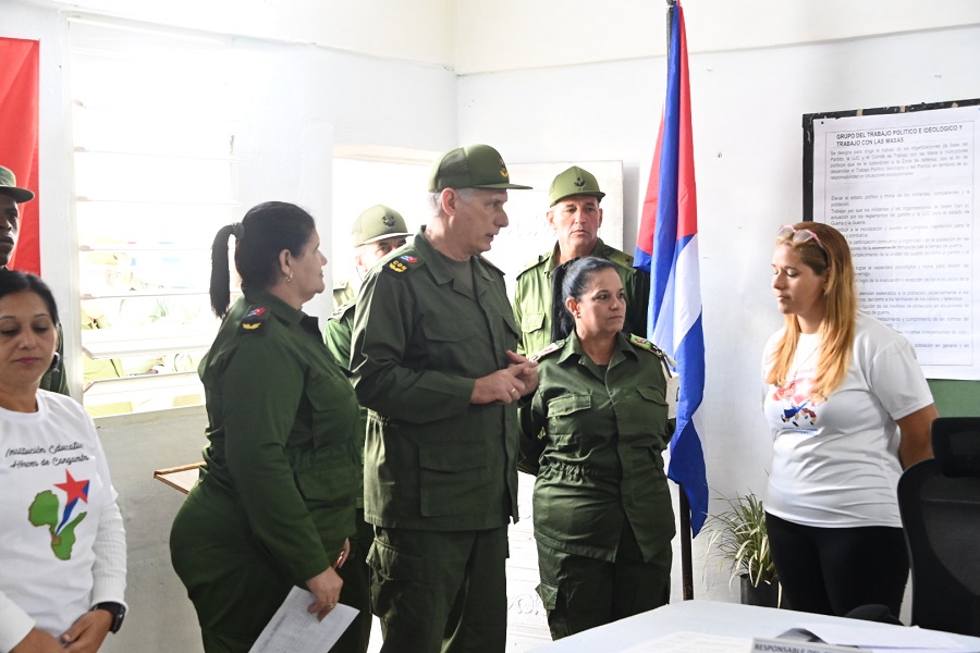 En intercambio con la Presidenta del Consejo de Defensa Municipal, Yamilé Mena Pena, el Presidente del Consejo de Defensa Nacional constató igualmente la preparación de los diferentes niveles del sistema defensivo territorial y las misiones que cumplen en tiempo de guerra los jefes y oficiales, las Milicias de Tropas Territoriales, las Brigadas de Producción y Defensa, además de los grupos y entidades ubicados en territorio.
