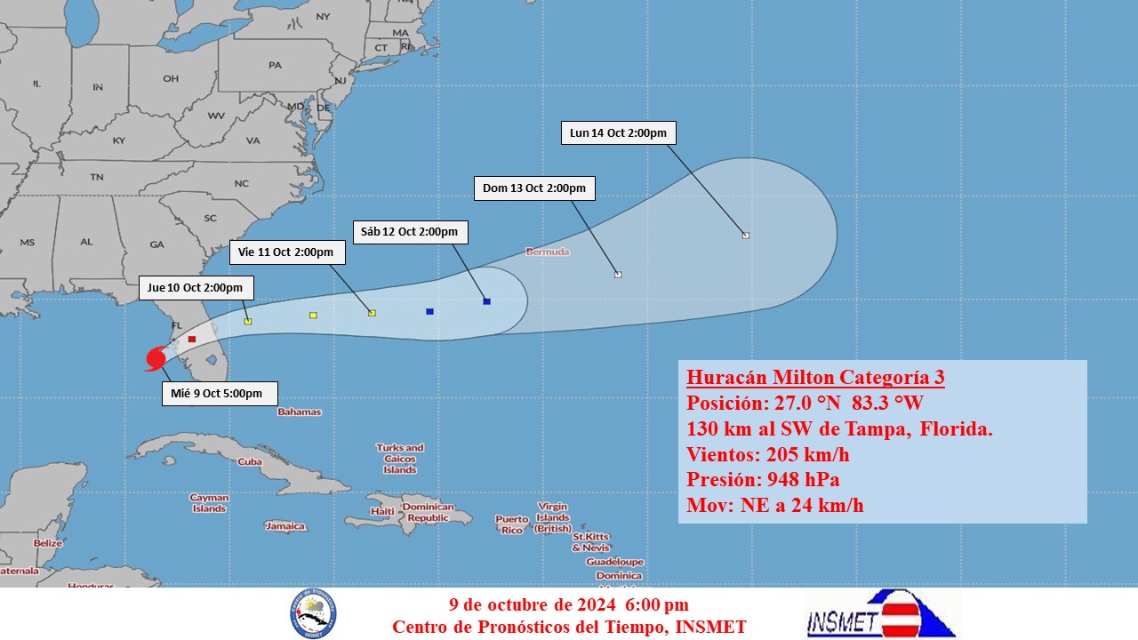 El huracán Milton ha continuado desplazándose al nordeste con una velocidad de traslación de 24 kilómetros por hora y se encuentra muy próximo a la costa oeste de La Florida. Durante la tarde ha tenido fluctuaciones en su intensidad, aunque se mantiene como un huracán categoría tres de la escala Saffir-Simpson. Sus vientos máximos sostenidos son de 205 kilómetros por hora, con rachas superiores y su presión mínima central ha ascendido hasta 948 hectopascal.