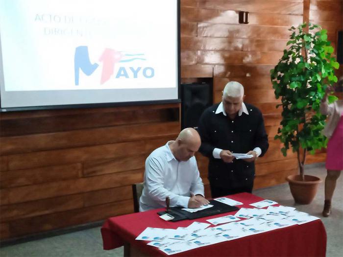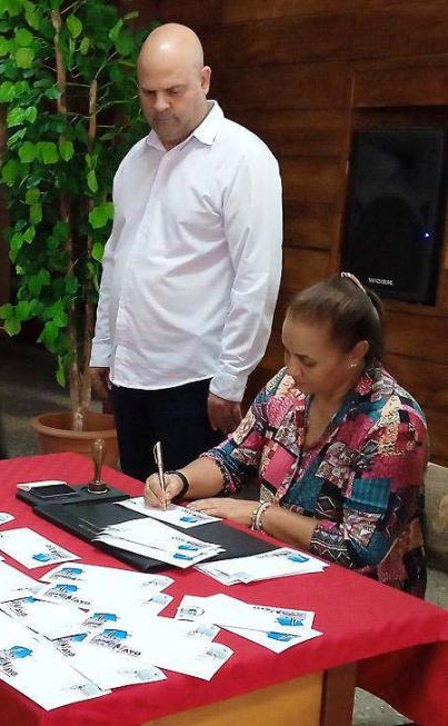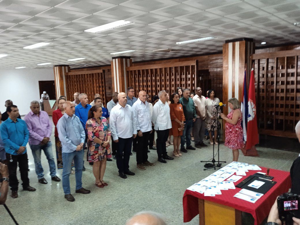 Osnay Miguel Colina Rodríguez, integrante del Comité Central del Partido Comunista de Cuba y presidente de la Comisión Organizadora del XXII Congreso de la CTC junto a Ana Julia Marine López, viceministra del Ministerio de Comunicaciones, realizaron la cancelación del sello postal escogido de una emisión del año 1998, cuando celebraron el aniversario 60 de la CTC.