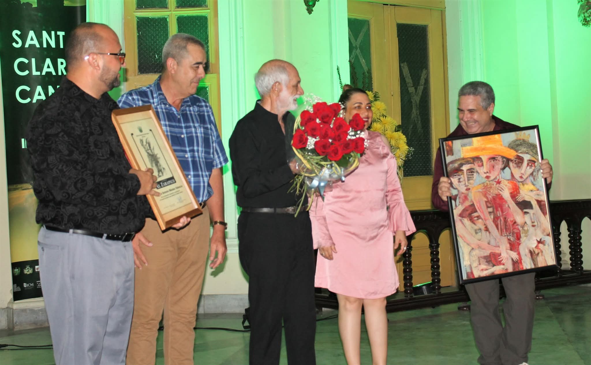 La miembro del Comité Central del Partido y su primera secretaria en Villa Clara Susely Morfa González y el vicegobernador Noel Chinea Pérez, así como el subdirector de cultura en la provincia Fidel Ernesto Tejeda, agasajaron a tan reconocido artista con una obra de la plástica de Juan Ramón Valdés, Yiki y la ovación cerrada de los santaclareños asistentes a la Sala Caturla de la Biblioteca Provincial Martí.