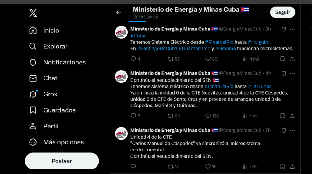 El Ministerio de Energía y Minas informó desde su cuenta en X que ya hay Sistema Eléctrico desde Pinar del Río hasta Holguín. Añadió que en Santiago de Cuba, Guantánamo y Granma funcionan microsistemas.