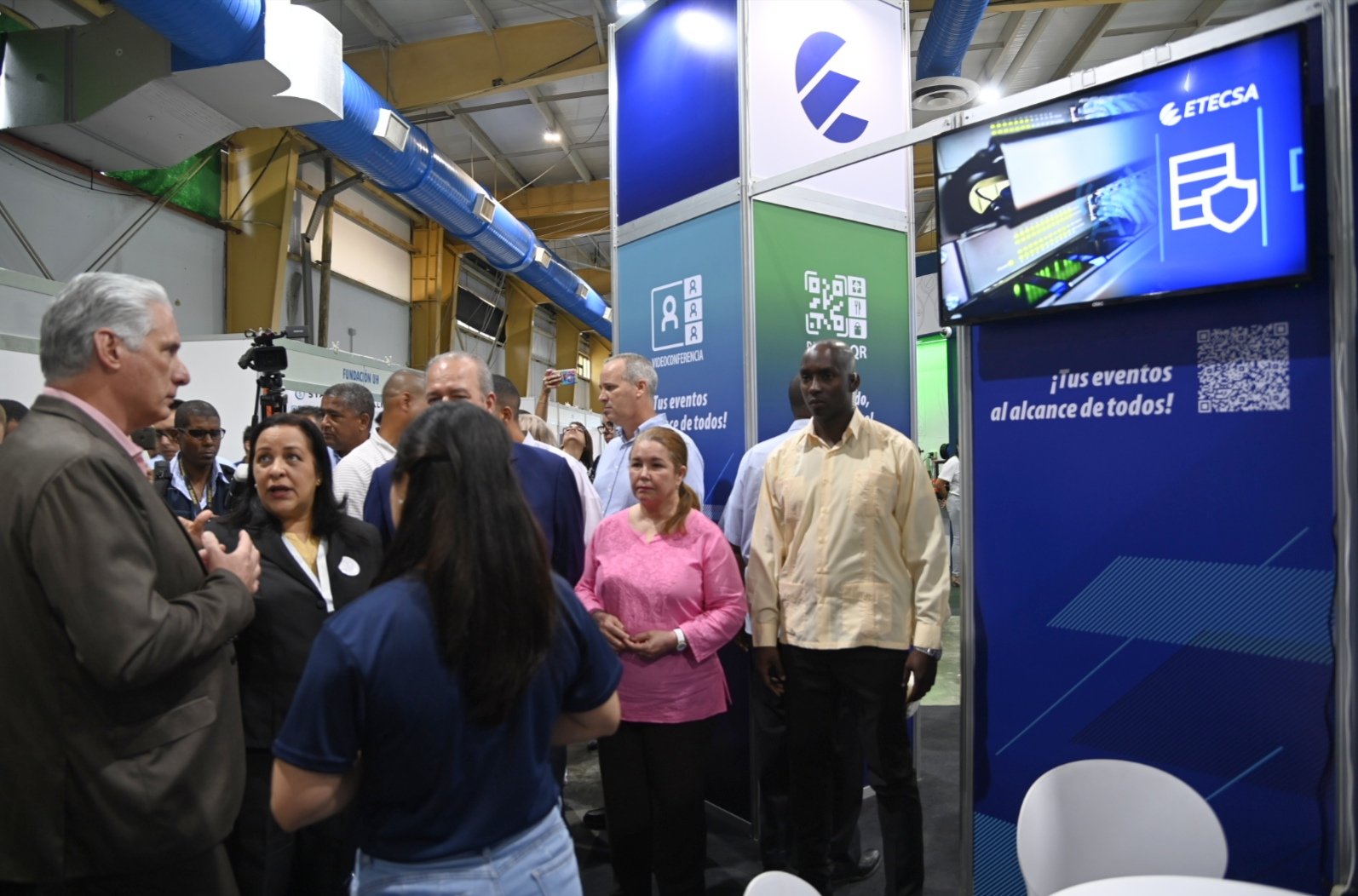 El Presidente Díaz-Canel luego de cortar la cinta junto a la Ministra de Comunicaciones, Mayra Arevich Marin, recorrió los stand de la Feria, entre ellos los pertenecientes a ETECSA, XETID, la Empresa de Tecnología de la Información, Haitech, así como las representaciones de negocios chinos, rusos, indios e iraníes.