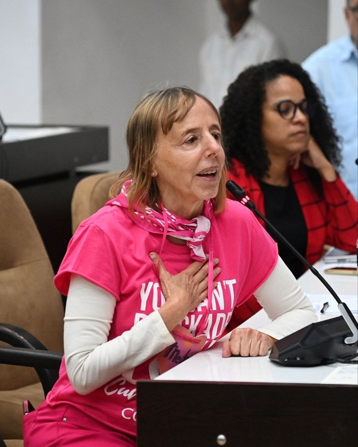 En representación de Estados Unidos, Medea Benjamin, cofundadora de CodePink, llevó la voz de la solidaridad desde el corazón del imperio. “Nosotros venimos con los corazones muy deprimidos en el sentido de que estamos viviendo en un país donde nuestro presidente dice que puede tomar el país de Cuba y hacer con ella lo que le dé la gana”, confesó, pero aclaró que esa postura “no representa el pueblo de los Estados Unidos”. Anunció que llevarán las historias de estos días a sus congresistas para exigir el fin del bloqueo.