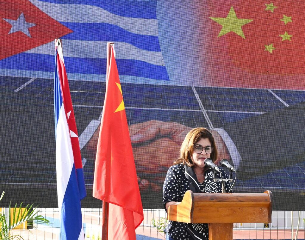«La cooperación de China con Cuba en el sector energético se mantiene firme y constante, desde los proyectos en marcha, tales como equipamiento y repuestos para la generación distribuida, los cinco mil sistemas fotovoltaicos para viviendas aisladas y la instalación de otros parques solares fotovoltaicos (PSFV) con una potencia total de 85 MW, hasta el próximo proyecto de instalación de otros 200 MW».