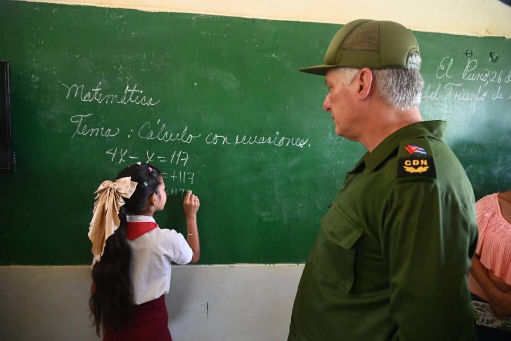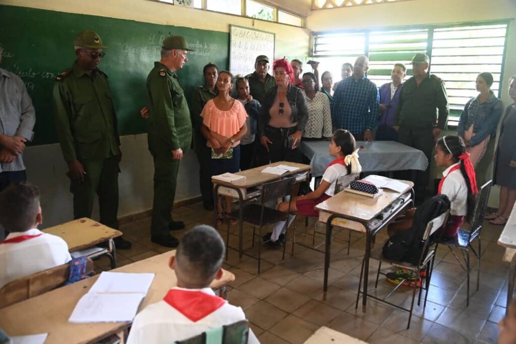 Particularmente emotivo fue el diálogo entre el dignatario cubano y el colectivo de la escuela primaria Rubén Martínez Villena, en El Purio, que cuenta con una matrícula de 61 estudiantes. ¿A alguno se le echó a perder el uniforme, quienes tuvieron problemas en su casa, se les mojaron los libros?, indagó Díaz-Canel, quien también en medio de una clase de Matemáticas, orientó a una alumna en la solución de una ecuación.