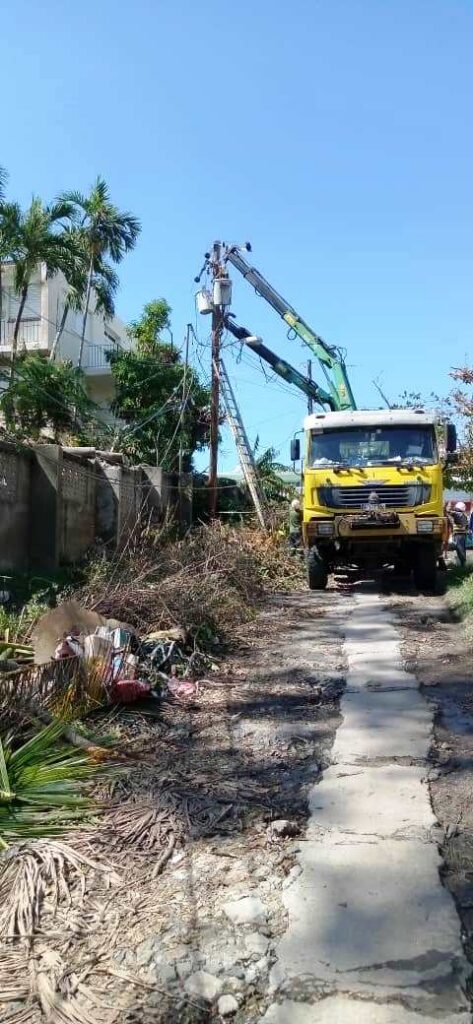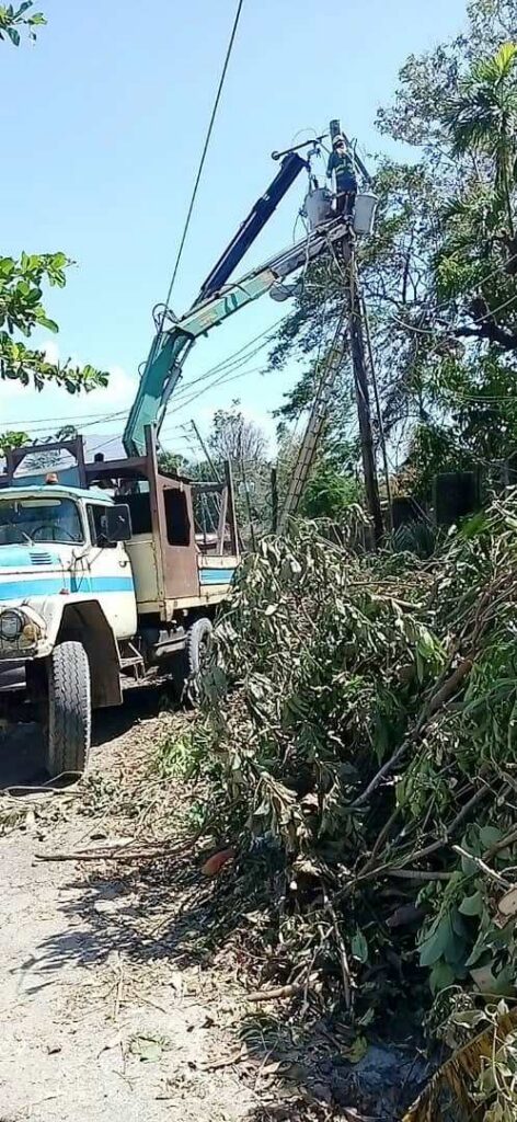 Un Contingente de trabajadores de la Empresa Eléctrica de Cienfuegos integrado por 70 linieros y personal de apoyo junto con varios equipos labora en Santiago de Cuba recuperando el servicio que afectó el Huracán Melissa.