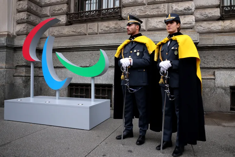 IMAGE CREDIT: Italian police officers stand next to an installation depicting the Paralympics Agitos, before the 25th edition of the Milano Cortina Olympic Winter Games [Claudia Greco/Reuters]