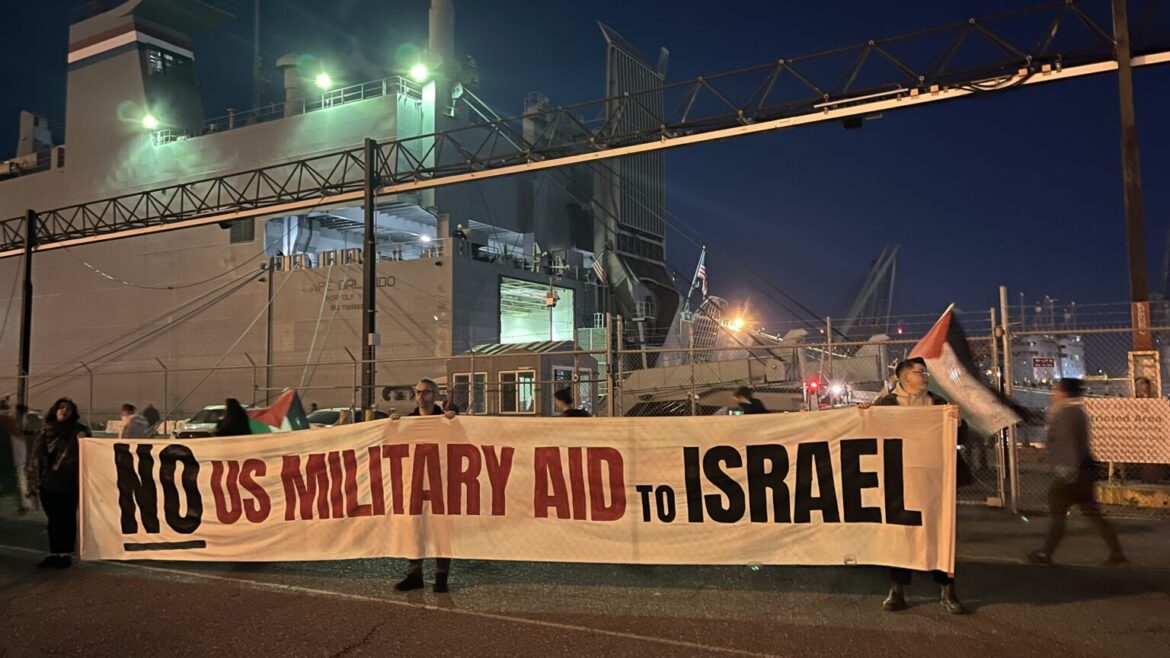 IMAGE CREDIT: Dockworkers in the U.S. have blocked shipments of weapons to Israel. Photo via AROC / Oakland Rallies to Block Boat Carrying Israeli Arms Shipment in November 2023