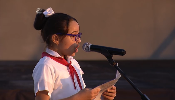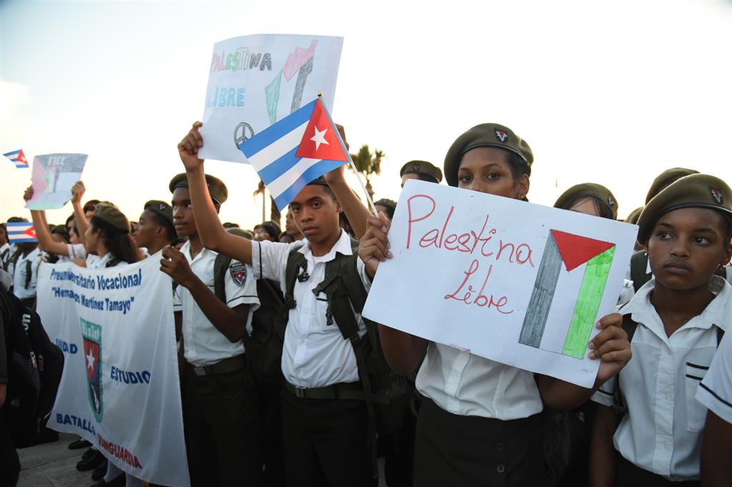 Por su parte, la pionera Sabrina Padín, estudiante de la escuela primaria Nicolás Estévez, del municipio capitalino de Plaza de la Revolución, se dirigió a sus “compañeros pioneros palestinos”, cuyas escuelas están en ruinas y cuyas familias se esconden para sobrevivir.