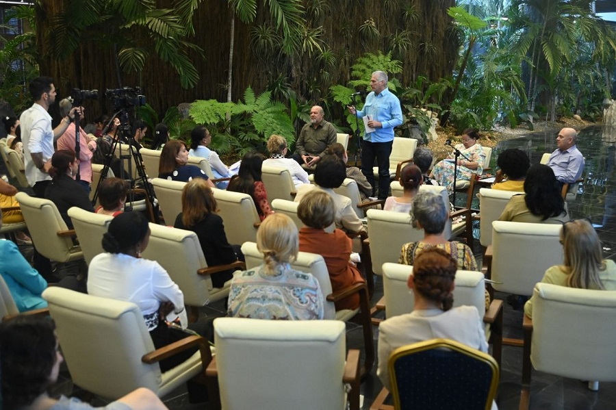 Durante el encuentro, desarrollado en el Palacio de la Revolución, el Jefe de Estado estuvo acompañado por los miembros del Buró Político, Manuel Marrero Cruz, Primer Ministro; Roberto Morales Ojeda, secretario de Organización del Comité Central del Partido, y Teresa Amarelle Boué, Secretaria General de la Federación de Mujeres Cubanas, quien además condujo el diálogo durante poco más de dos horas.