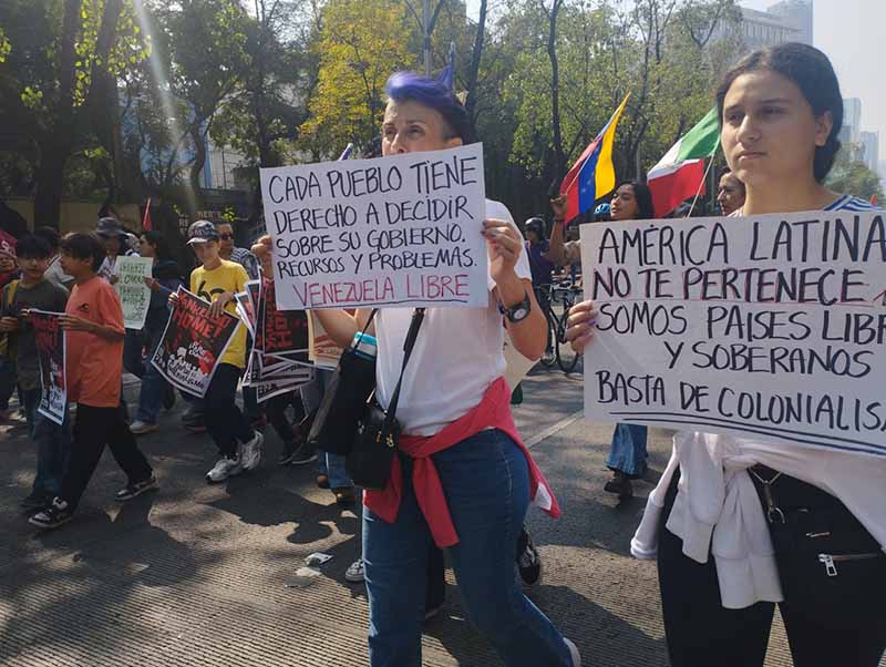 Con banderas de México y Venezuela, y en algunos casos de Cuba y Palestina, los participantes defendieron la autodeterminación del país suramericano y denunciaron los ataques ordenados por el presidente estadounidense, Donald Trump, hace justamente una semana.