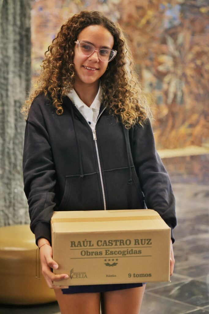 Luego, muchachas y muchachos recibieron como obsequio las Obras Escogidas de un cubano que lo ha dado todo por su país, una compilación de textos que nos acerca al líder revolucionario y al extraordinario ser humano que es Raúl.