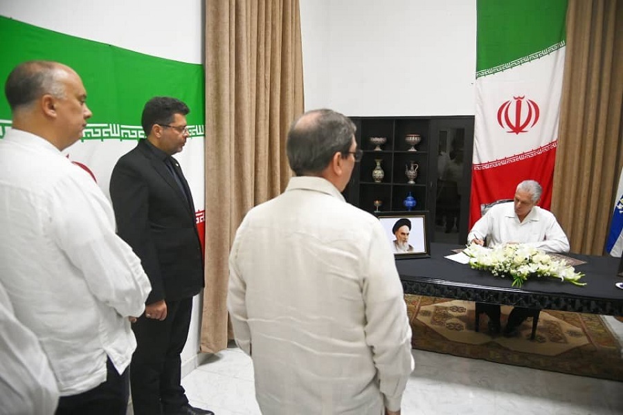 En la sede diplomática en La Habana, Díaz-Canel fue recibido por el embajador iraní Zabihollah NADERÍ; y estuvo acompañado en la sencilla ceremonia por el miembro del Buró Político y ministro de Relaciones Exteriores, Bruno Rodríguez Parrilla, y el director general de Asuntos Bilaterales de la cancillería, Carlos Miguel Pereira Hernández.