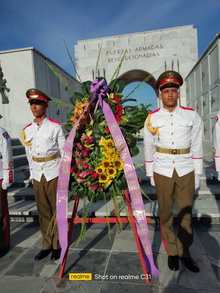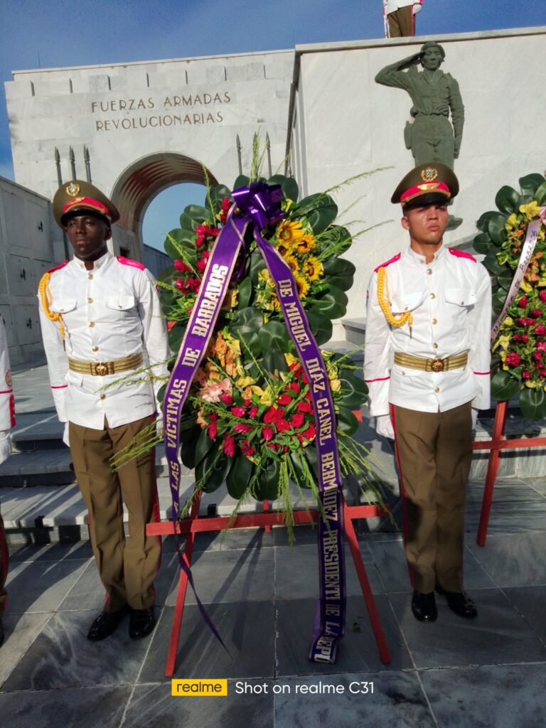 Ofrendas florales en nombre del General de Ejército Raúl Castro Ruz, líder de la Revolución cubana, y de Miguel Díaz-Canel Bermúdez, Primer Secretario del Comité Central del Partido Comunista de Cuba y Presidente de la República y del pueblo de Cuba encabezaron la peregrinación realizada este lunes en el Panteón de las Fuerzas Armadas Revolucionarias (FAR) de la Necrópolis de Colón, en La Habana, en conmemoración del Crimen de Barbados y en condena a esa terrible acción ocurrida hace 49 años.