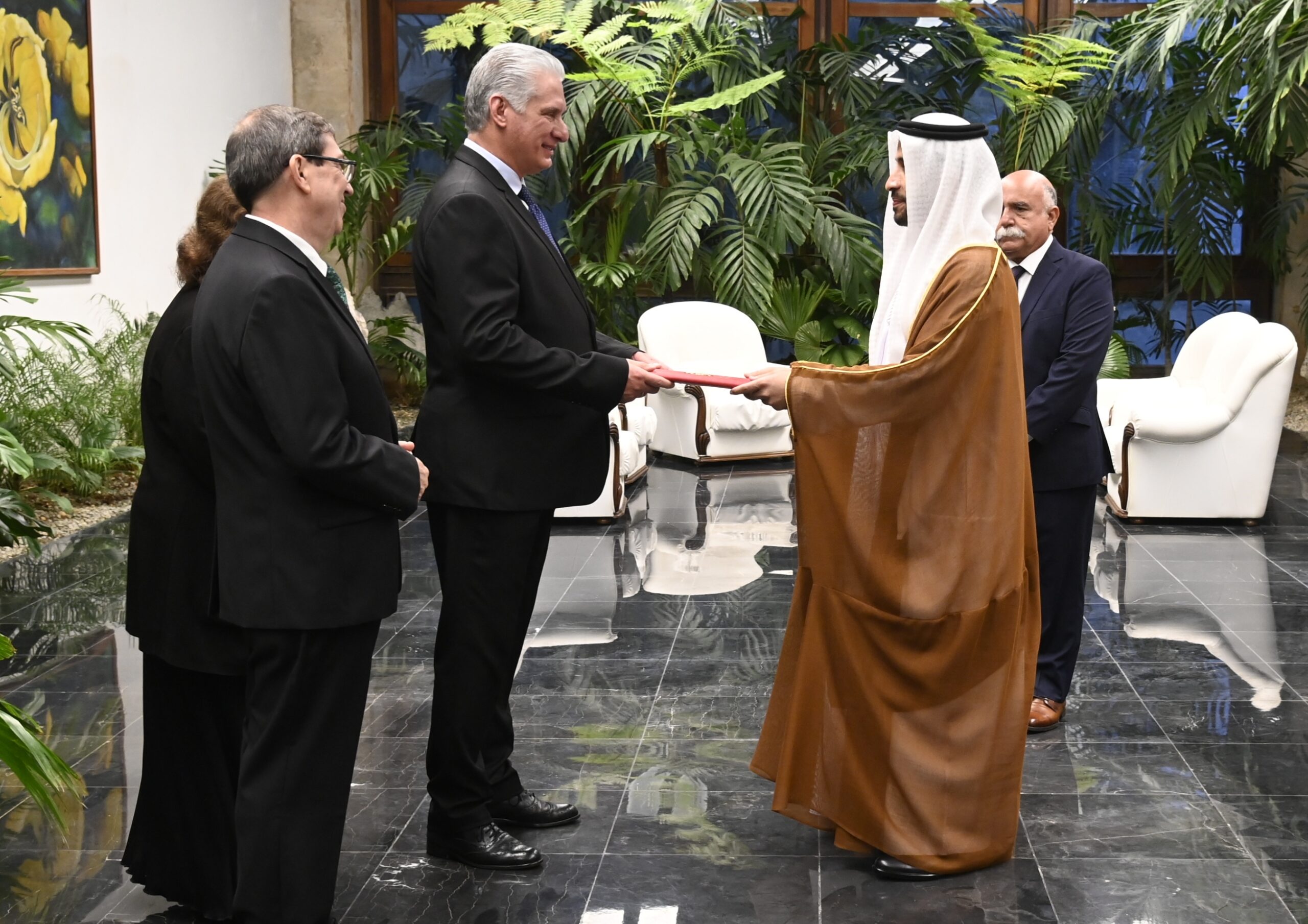 Minutos después -luego de la habitual sesión de fotografía que se dedica a cada entrega de Cartas Credenciales- arribó al salón el Excelentísimo Señor Hazza Ahmed Khamis Alkaabi, Embajador de Emiratos Árabes Unidos, país que será sede a finales de año, de la Conferencia de las Partes de la Convención Marco de las Naciones Unidas sobre el Cambio Climático. Por su importancia, este fue un tema mencionado durante el saludo entre el Presidente cubano y el Embajador de esa nación ubicada en el sudeste de la Península Arábiga.