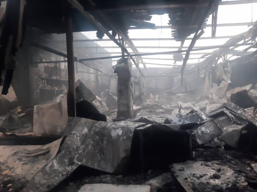 Fuerzas del Cuerpo de Bomberos, con el apoyo de trabajadores de la entidad, laboran aún en la extinción de la llamas, propagadas rápidamente por la acumulación de material combustible (plástico) en el lugar del siniestro.