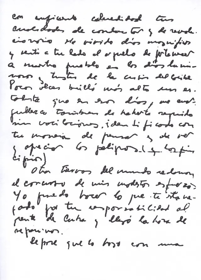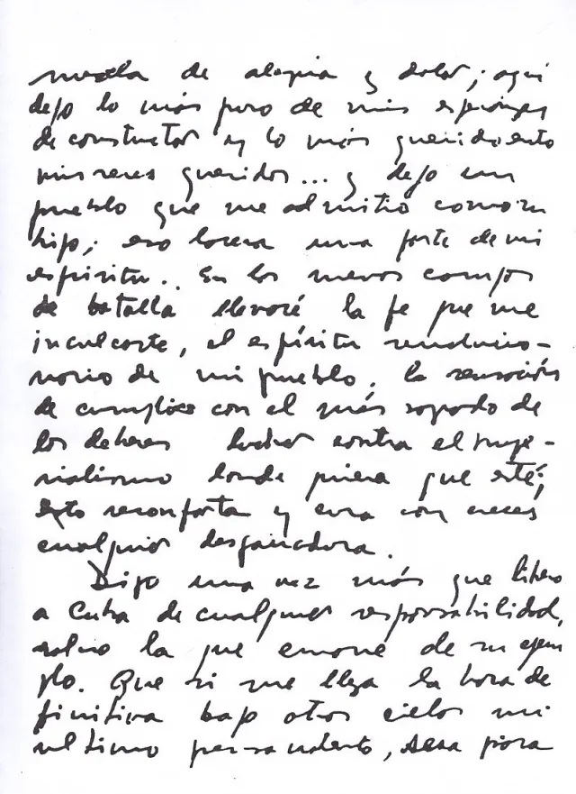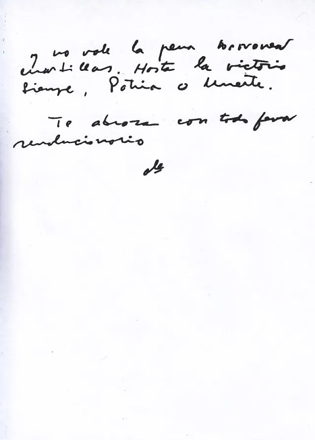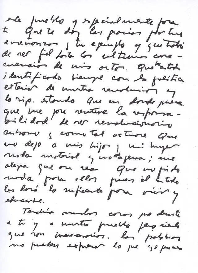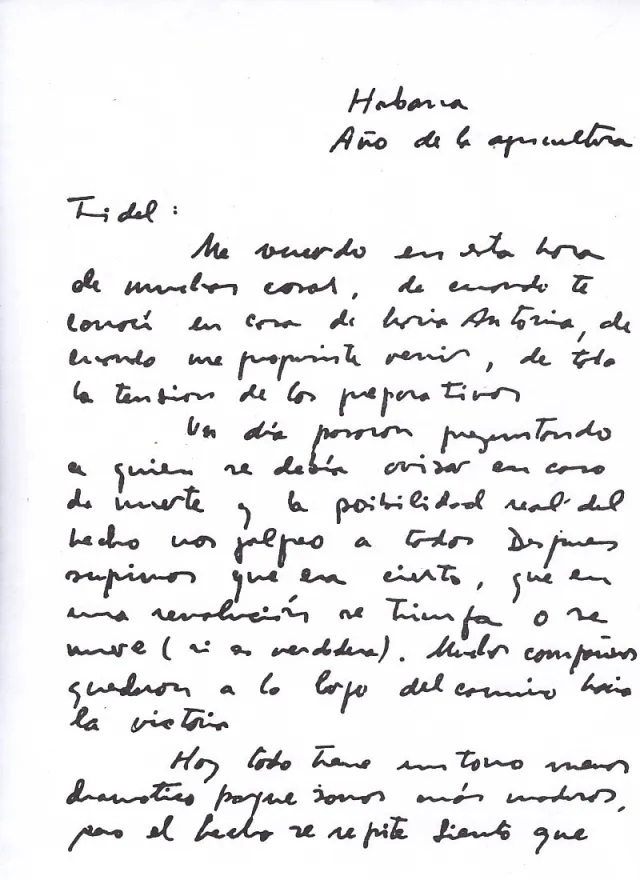 «Siento que ya he cumplido la parte de mi deber que me ataba a la Revolución cubana en su territorio y me despido de ti, de los compañeros, de tu pueblo, que es ya mío (…) Otras tierras del mundo reclaman el concurso de mis modestos esfuerzos (…) luchar contra el imperialismo dondequiera que esté; esto reconforta y cura con creces cualquier desgarradura (…) si me llega la hora definitiva bajo otros cielos, mi último pensamiento será para este pueblo y especialmente para ti…».